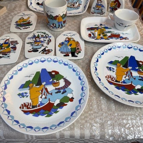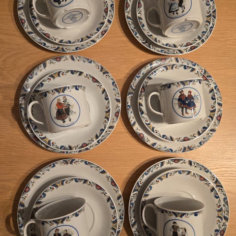 Egnerinspirert Karius og Baktus sett for barn. To flate, to dype tallerkner pluss fire krus fra Figgjo selges. Gi bud.