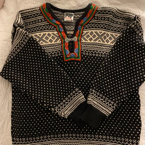 Dale of Norway ullgenser for herre i størrelse L. Genseren er i svart ull med tradisjonelt mønster i blått, grønt og rødt. Den har høy hals med glidelås og ribbestrikkede kanter nederst og på ermene. Materiale: ull. Farge: svart med flerfarget mønster.