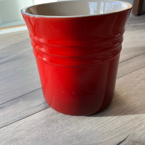 Som ny, Le Creuset redskapskrukke i fargen Cerise (kirsebærrød).