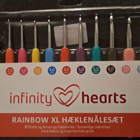 Infinity Hearts Rainbow XL heklenålesett med heklenåler i ulike størrelser. Settet inneholder flere heklenåler med ergonomiske, flerfargede håndtak og metallkroker. Egnet til heklearbeid med garn i forskjellige tykkelser, og passer til både hobbybruk og mer detaljert håndarbeid.