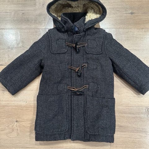 Mørkegrå kåpe i str.98/104. Pent brukt.