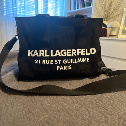 Karl Lagerfeld skulderveske for dame i svart skinn. Lengde 25cm og høyde 16cm. Den har justerbar og avtakbar skulderrem samt avtakbar håndleddsrem. Utsiden har en glidelåslomme. Hovedrommet lukkes med glidelås og er egnet til oppbevaring av mindre eiendeler som mobil, nøkler og lommebok.