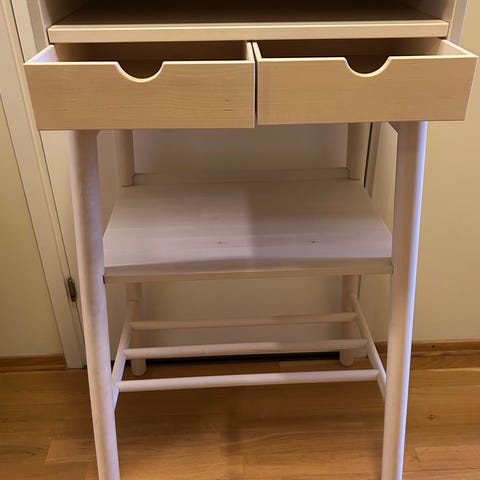 Det finnes noen bruksspor, som vises på bildene i annonsen. Det er stabilt, skuffen glir fint og fungerer som den skal.