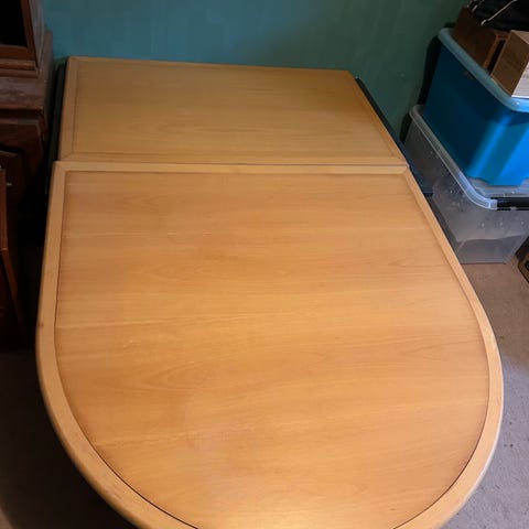 Platen er i heltre. Ileggsplatene matcher og lagres under bordplaten.