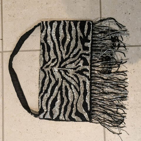 Brodert med stavperler i hvitt og grått. Lukkes med perle og hempe (litt sliten). To rom inni. Merkelapp med «HAND MADE IN FRANCE». Enkelte mangler. 10 x 16 cm.