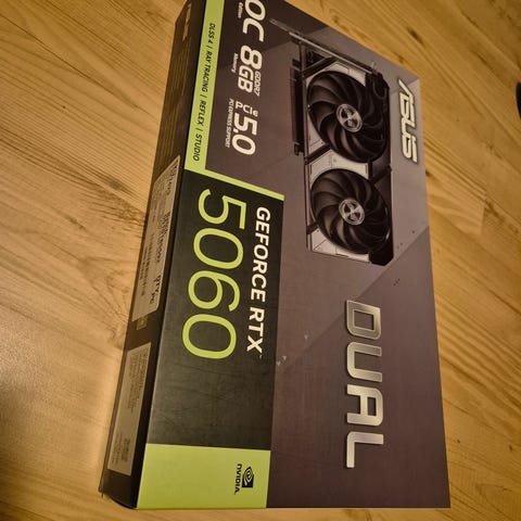 Skjermkortet har 3 x DisplayPort 2.1 og 1 x HDMI 2.1b for tilkobling av skjermer, og støtter NVIDIA DLSS 4 og G-Sync. Strømtilkobling skjer via 1 x 8-pins kontakt, og anbefalt strømforsyning er min. 550 W. Kortlengden er 229 mm og det opptar 2,3 spor i kabinettet. ASUS Dual-kjøleløsning med to vifter er beregnet for stabil drift under belastning.