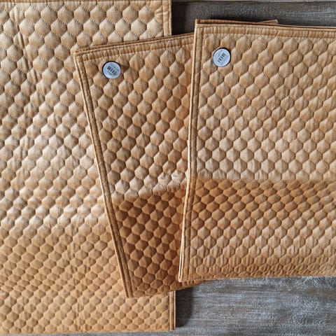 Gardinkappe i lin med maljer. Påtrykt mønster av høner og haner. Bredde 280 cm, høyde 42,5 cm.