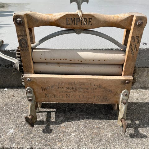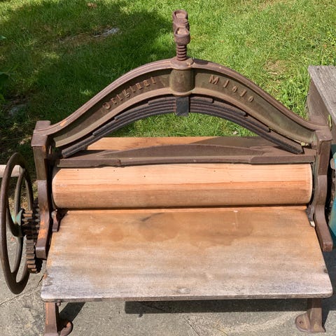 Gammel vrimaskin/klesrulle «Anchor Brand", tidlig 1900-tallett, stål og tre, høyde ca 47 cm.