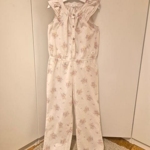 Kjempesøt Newbie jumpsuit i størrelse 122. Jumpsuiten er i myk bomull med flerfarget blomsterprint på lys bunn. Modellen har smock over brystet, volangdetaljer på skulderstroppene og strikk i midjen for bedre passform. Passer til hverdagsbruk med en genser under, eller sommerbruk.