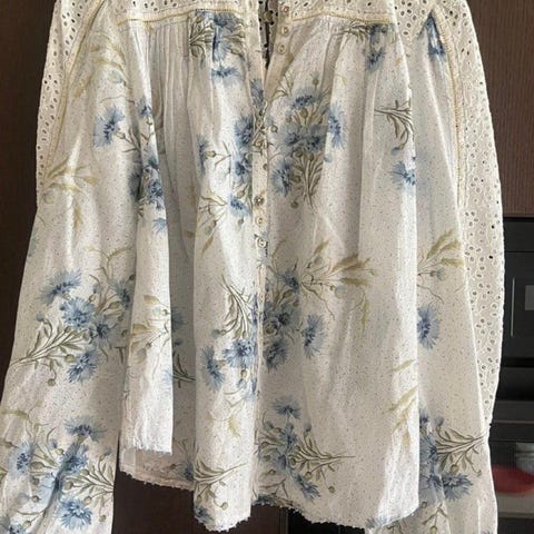 byTiMo bluse i størrelse L for dame. Blusen er laget i bomull/viskose og har et flerfarget blomsterprint på lys bunn. Modellen har krage, gjennomgående knappestolpe foran og lange ermer med mansjetter. Skuldre og øvre del av ermer har blonde- og hullbroderidetaljer. Stoffet er lett og faller mykt, egnet til bruk både til hverdags og mer pyntede anledninger. Blusen har ikke vært brukt, men lappen er fjernet.
