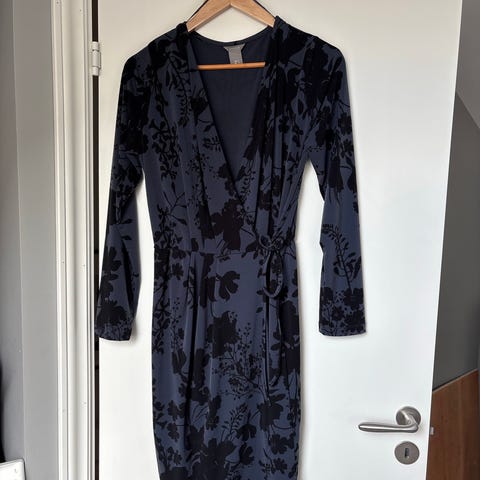Omslagskjole i nervøs fløyel fra & Other Stories. Knytes igjen med et bånd i samme materiale (båndet sitter fast i kjolen), og egner seg også fint som en kimono 👘. Pent brukt.