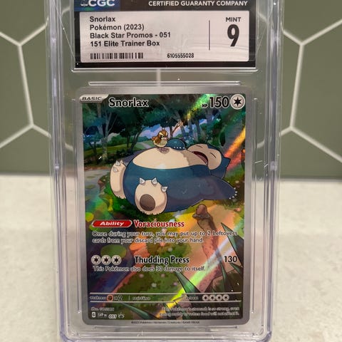 Pokémon samling graderte kort CGC. Bildene viser flere ulike Pokémon-kort innkapslet og vurdert av CGC (Certified Guaranty Company), med karakterer fra 8,5 til 9,5. Kortene er lagt i harde plastkapsler med etikett som angir kortnavn, sett, språk, type (for eksempel holo eller spesial art) og den tildelte graden. Egner seg som samlerobjekter eller som del av en eksisterende Pokémon-kortsamling.
