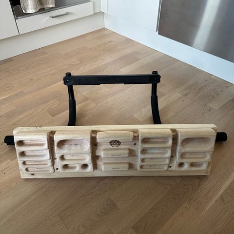 Beastmaker 1000 Series fingerboard i tre. Treningsbrett for klatring med flere ulike lister, lommer og grepdybder for finger- og overkroppsstyrke. Monteres på vegg over døråpning eller lignende solid underlag. Egnet til oppvarming, styrketrening og spesifikk fingertrening for klatrere på ulike nivåer.