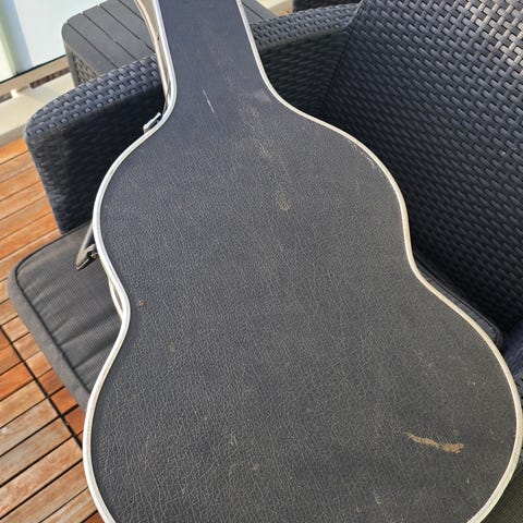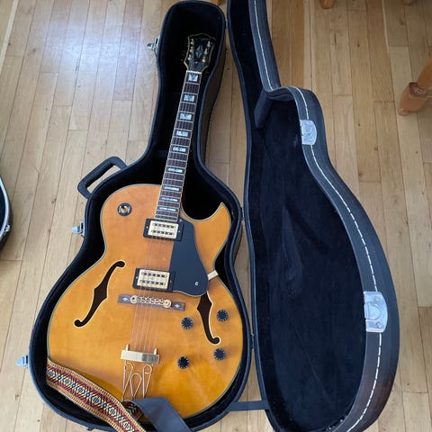 (AI beskrivelse):Angelico halvakustisk resonatorgitar i sunburst-finish. Gitaren har innebygd resonator med metallplate og to lydhull på oversiden av kroppen. Den er utstyrt med pickup og kontroller på kroppen for elektrisk tilkobling. Hals med gripebrett i tre og seks stemmeskruer på hodet. Kroppen har binding langs kantene og blank lakk. Egnet for bruk med både akustisk og elektrisk forsterkning, og passer til sjangre som blues, country og roots-musikk der resonatorklang er ønsket.