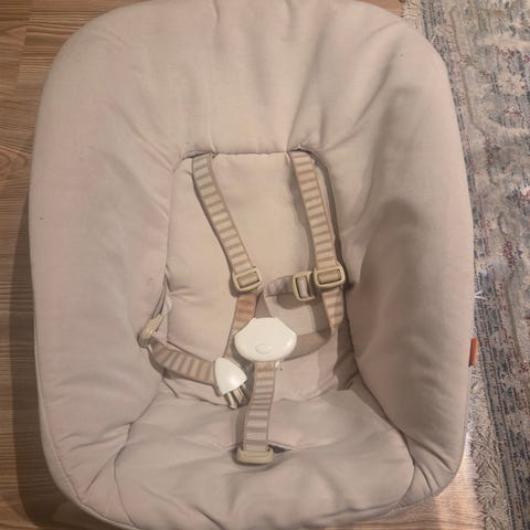 Stokke newborn sete med vendbart trekk (stjerner eller grønne «kruseduller»). Setet har fempunktssele. Det beige trekket er hovedtrekket med pute til hodet, mens det andre er greit for å vaske oftere.