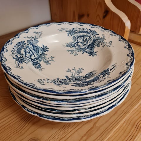 Har 9 stk suppetallerker kr 75 pr stk.