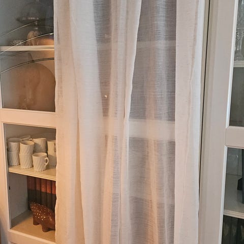 Usikker på merket, tror det er IKEA. Liftgardin i beige tekstil. Gardinen monteres øverst i vinduskarmen og heves eller senkes med snortrekk. Passer til innvendig montering på vindu som vist på bildene, og gir skjerming for innsyn og lysdemping i rommet. Egnet til bruk i stue, soverom eller andre oppholdsrom der man ønsker en enkel tekstilgardin med horisontale folder.