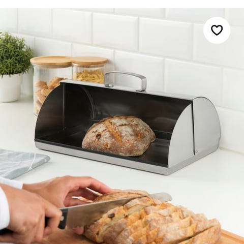 IKEA brødboks i stål. Brødboksen har buet lokk med håndtak i front som kan vippes opp for enkel tilgang til innholdet. Laget i metall med børstet stålfinish, egnet til oppbevaring av brød og annet bakverk på kjøkkenbenken. Enkel å plassere på benk eller i hylle.