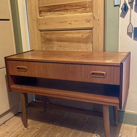 Det er med tungt hjerte vi selger vår vintage teak kommode/skjenk med klaffedør og skuff, grunnet flytting. Den har blitt brukt som både tv-bord og kommode i entreen. Hull bak for ledninger, så topp for å skjule en spillkonsoll o.l.