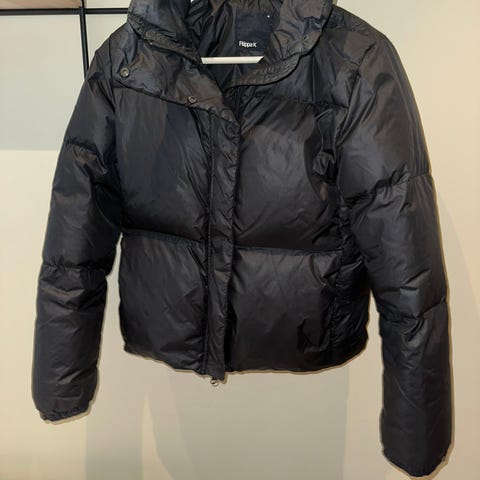 Svea dunjakke for dame i størrelse M. Jakken er svart og fylt med dun. Den har kort, rett passform med høy krage og horisontale vatterte felt. Svea-logo er brodert på brystet, og det er en flaggpatch på ermet. Glidelåslukking foran. Egnet som ytterjakke i kjøligere vær.