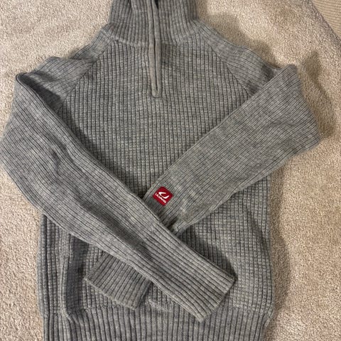 Ullgenser fra Ulvang med høy krage med glidelås og tommelhul i strl. xs. Selges for kr 300.