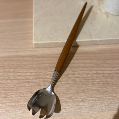 Selger en klassisk Skaugum teskje med hvitt skaft og blankt stål.