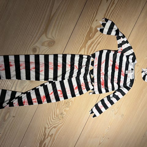 skjelett kostyme i det jeg er ganske sikker på er størrelse 98 (lappen er dessverre blitt klippet bort). Det har passet sønnen fra han var 3 år og frem til han ble 5 år, og han er en lang gutt (måler 120 cm nå og er 5,5 år