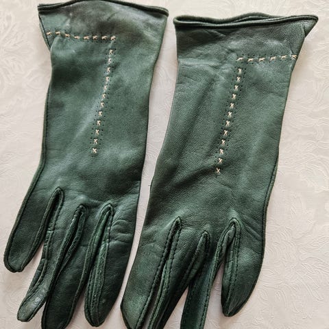Lange hansker til ermeløs gallakjole. Utsøkt kvalitet i fineste sjevrå-skinn. Myke, delikate og antakelig kun brukt én gang av min mor. De har en svak vårgrønn farge, Meget fint sydd, med rulour langs åpningen ved håndleddet og passepoilerte knapphull. Isydde kiler ved tommel og fingre. Merket Nellah, str.7. Lengde: 56,5 cm. Slike får man ikke kjøpt idag. Kan hentes eller sendes som brev eller Postens lille Norgespakke for kr 76. Tar kr 10 for emballasjen hvis jeg må sende. Har Vipps.