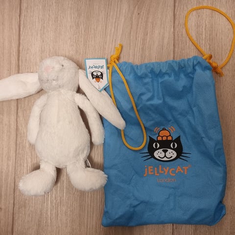 Trois Petits Lapins koseklut med kanin. Kosekluten har mykt kaninhode med lange ører og knuter i hjørnene som er enkle for barnet å gripe. Stoffet er mykt og egnet for små barn og babyer. Passer som kose- og trøsteleke i vogn, seng eller lekegrind.