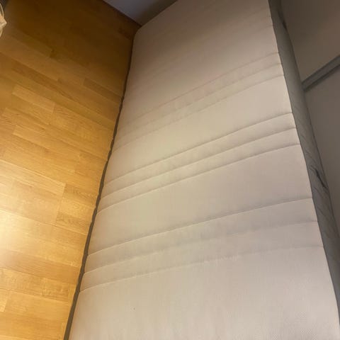 IKEA madrass i hvit farge. Madrassen har et enkelt, quiltet mønster på overflaten. Egnet til bruk i seng eller gjesteseng der det er behov for en enkel liggeflate. Yttermaterialet ser ut til å være tekstil/trekk som kan gi et jevnt og mykt underlag. Størrelse og type madrass er ikke oppgitt og bør måles ved interesse.