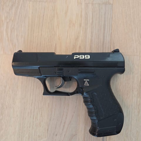 Med pistolhylster til å feste i belte.