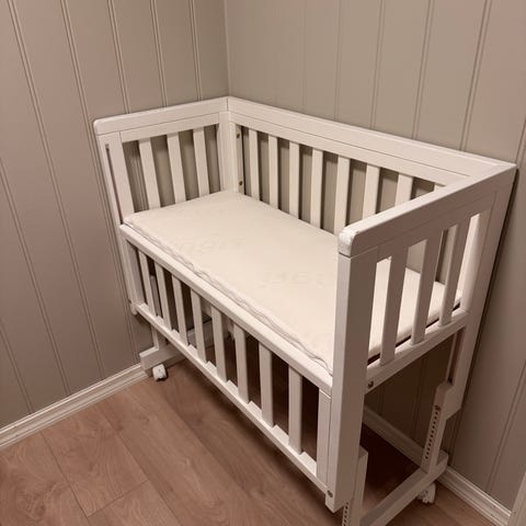 Pent brukt - i god stand (brukt av flere barn) med få bruksmerker. Litt bevegelse i justerbar side (normalt for dropside-modeller med hjul), men mer stabil når festet mot seng.