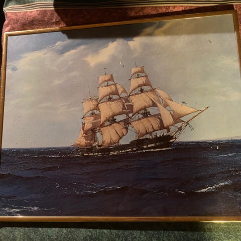 Bildet er innrammet og viser et tredimensjonalt seilskip i midten, omgitt av ulike maritime detaljer som årer, tau og lanterne. Bakgrunnen er blå, og rammen er i tre med lys innerramme. Passer som veggdekor i for eksempel stue, gang eller hytte med maritimt preg.