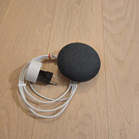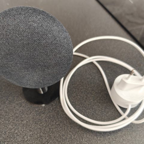 Google Home Mini smart høyttaler i grå farge. Kompakt høyttaler med innebygd stemmestyring og trådløs tilkobling. Egnet for bruk til musikkavspilling, styring av kompatible smarthjem-enheter og taleassistentfunksjoner i hjemmet.