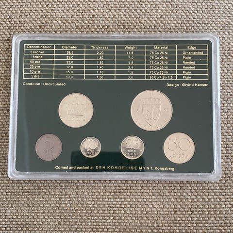 20 kr, 10 kr, 5 kr, 1 kr og 50 øre i originalt etui