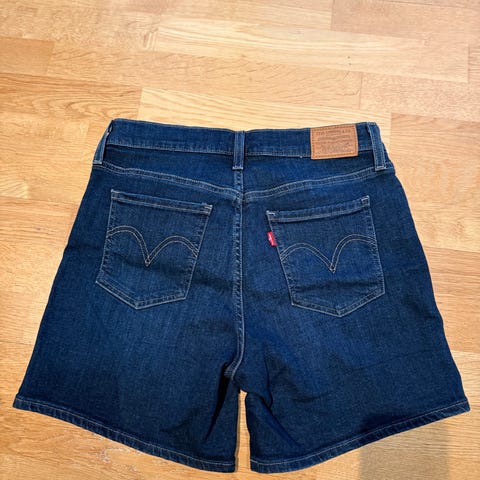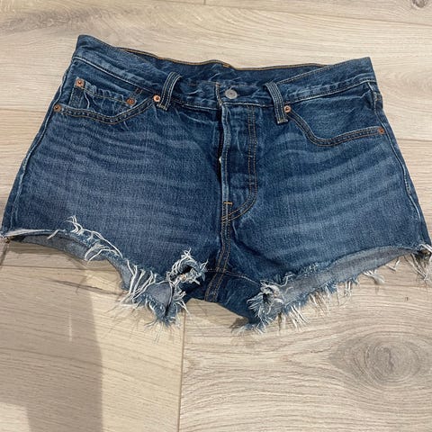 Levi's 501 denimshorts for dame i størrelse M med livvidde W28. Shortsen er laget i bomull og har klassisk blå denimfarge. Modellen har fem lommer, knappelukking foran og oppbrettede benkanter med lett frynset avslutning. Passer som hverdagsplagg eller til fritidsbruk i varmere vær.