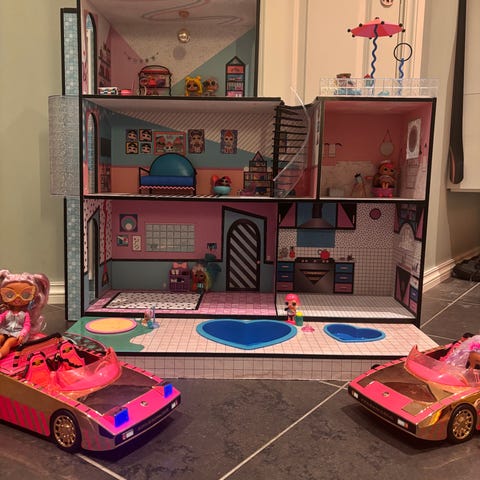 L.O.L. Surprise dukkehus med flere etasjer og ulike rom. Er med en del møbler og utstyr. Mangler en rosa plate ved garasjen.