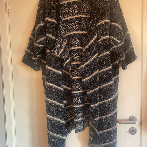 Amazing Clothing jakke for dame i størrelse 38. Jakken er flerfarget med et mønstret uttrykk og har en myk, lodden strikkestruktur. Den har åpen front uten lukking og påsydde lommer foran. Passer som en lett ytterjakke eller som en lang cardigan innendørs.