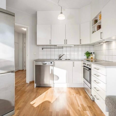 Dette kjøkkenet av ukjent type gis bort sammen med ovn, vaskemaskin og kjøleskap. Må hentes og bæres ut. Alt må tas med