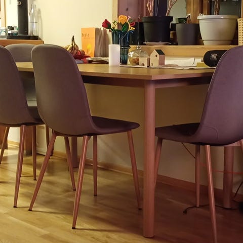 Stort spisebord med plass til 8-10 stoler rundt. Bordet er brukt og har noen riper og merker, men lite synlig uten direkte lys.