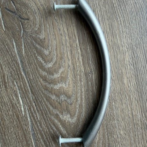 Buede møbelhåndtak i metall i sølvfarge. Håndtakene har avrundede ender med skruehull i hver ende for montering på skuffer eller skapdører. Leveres som flere like håndtak i plastpose, med tilhørende skruer for feste. Egner seg til bruk på kjøkkeninnredning, garderobeskap, kommoder eller andre møbler hvor det er behov for utskifting eller montering av håndtak.