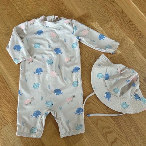 UV-drakt fra Cubus og solhatt fra H&M