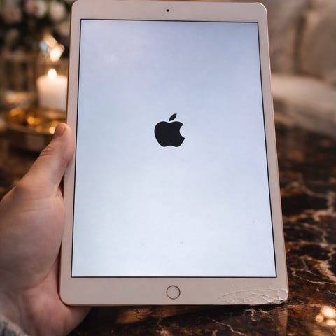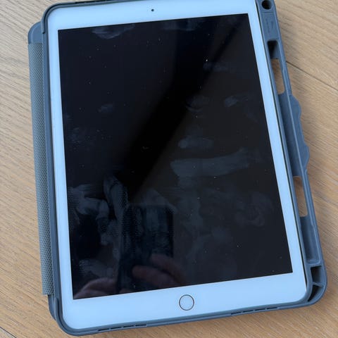 Apple iPad generasjon 7 nettbrett med 32 GB lagringskapasitet. Nettbrettet har berøringsskjerm og fysisk hjemknapp med integrert Touch ID. Bakdekselet er i fargen rose gold. Apple tastatur følger med.