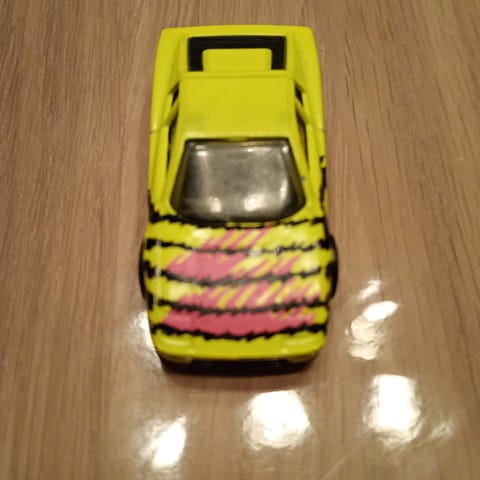 Lekebil i form av en sportsbil. Modellen er rød med gule vinduer og detaljer, og har fire hjul med felger i kontrastfarge. Passer som leke eller som enkel samlegjenstand for modellbiler.