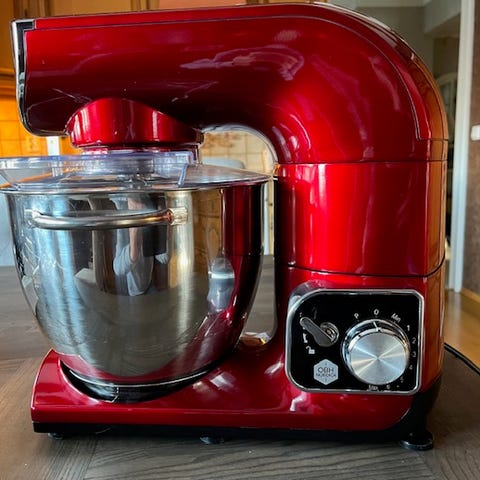 Ankarsrum Assistent kjøkkenmaskin i rød selges. Maskinen har stor rustfri stålbolle og leveres med flere tilbehør, blant annet plastbolle, deigkrok, visp, deigrulle, deigskrape og andre standardredskaper som følger med når den kjøpes ny (se bilde). Kjøkkenmaskinen er egnet til elting av deig, visping og blanding av ulike typer rører og matvarer i husholdningen. Strømtilkobling 220–240 V, 50–60 Hz, effekt 1500 W (modell AKM 6230R).
