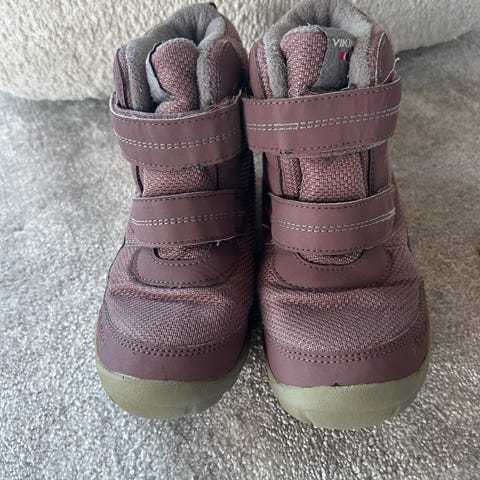 Viking barnesko i størrelse 32 for unisex. Skoene er i en lilla farge med rosa detaljer og har overdel i tekstil og syntetisk materiale. De har to borrelåsstropper for enkel justering og av- og påkledning. Yttersålen er i gummi med grovt mønster for godt grep. Passer til hverdagsbruk og utelek i kjøligere vær. Støvlene er kun brukt et par ganger, da de ble kjøpt for små.