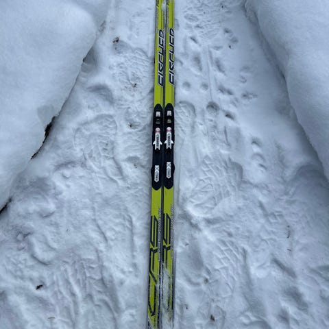 1. Brukte Fischer langrennski med tilhørende staver i svart og gul farge. Skiene har bindingssystem montert, og sålene vises på bildene.