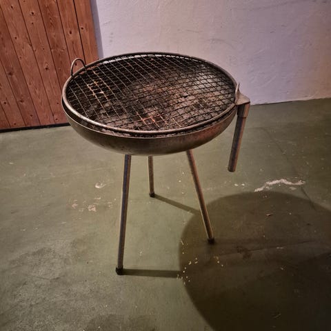 BBQ kullgrill rund med lokk i svart utførelse. Grillen har et rundt grillareal med metallrist og kullbunn. Den står på fire ben med to hjul for enkel flytting, samt en nedre hylle i metallrist til oppbevaring av utstyr eller kull. Lokk med luftventiler gir mulighet for å regulere trekken under grilling. Egnet til grilling utendørs på terrasse, hage eller lignende.