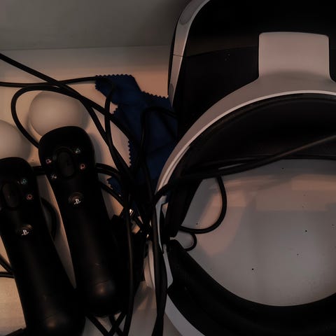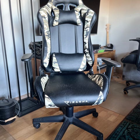 Stolen har høy rygg med integrert hodestøtte og sidevinger, samt justerbare armlener. Ubetydelig brukt.