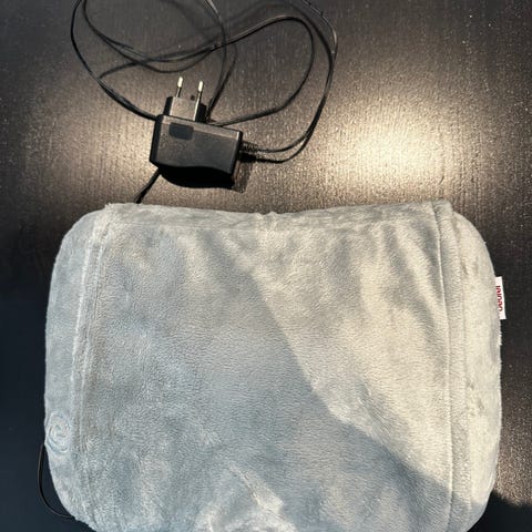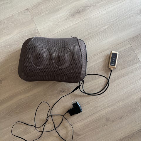 Beurer massasjepute i grått tekstiltrekk. Puten har nettingfelt på fremsiden der massasjemekanismen er plassert, og elastisk stropp på baksiden for feste til stolrygg eller lignende. Mykt ytterstoff i tekstil som kan gi behagelig kontakt mot hud eller klær. Egnet til bruk på rygg, nakke eller andre områder der man ønsker punktmassasje. Drives vanligvis med strømtilkobling (ikke synlig på bildene).